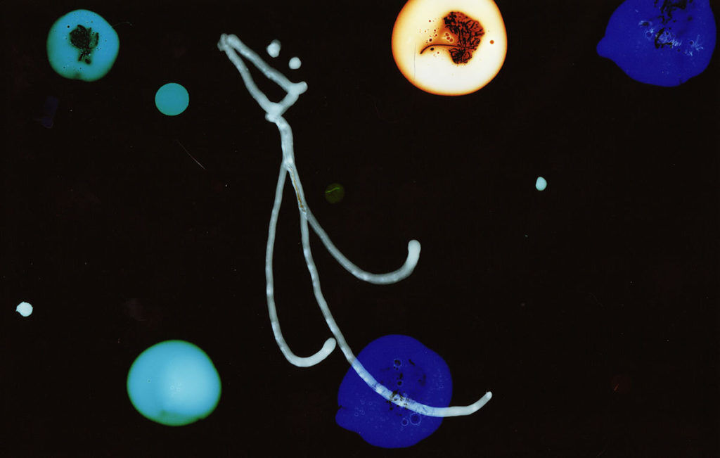 Film d’animation abstrait réalisé sans caméra où des formes et éclats colorés, gravés et peints directement sur la pellicule, improvisent visuellement sur le morceau Take Five de Dave Brubeck.